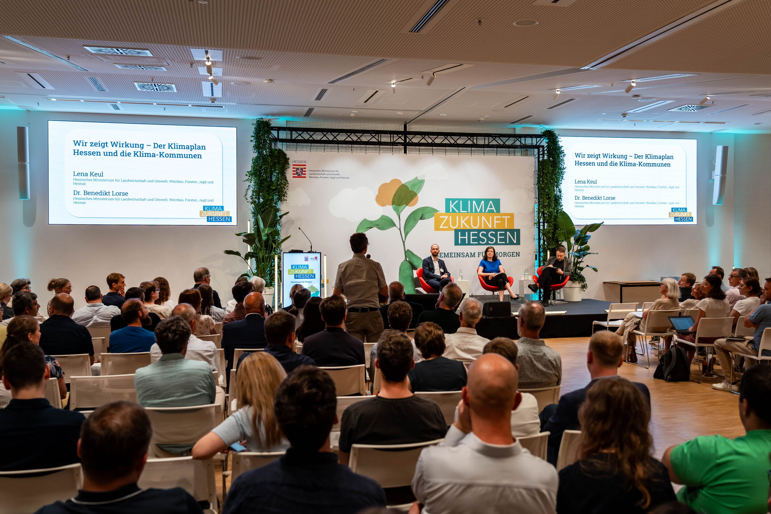 Nach dem Mittagessen folgte das Podiumsgespräch "Wir zeigt Wirkung - der Klimaplan Hessen und die Klima-Kommunen" mit Lena Keul, Leiterin des Referats Klimarecht im HMLU und Dr. Benedikt Lorse, Leiter des Referats Klimaförderung. Gemeinsam mit dem Publikum wurde über die Finanzierung von Klimaschutz und Klimaanpassung, über den Fortschritt bei der Umsetzung des Klimaplans Hessen und Neuerungen für die Klima-Kommunen diskutiert.